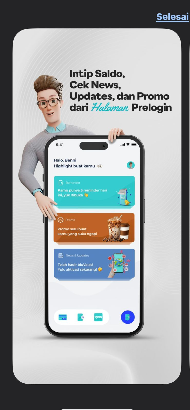 Pada halaman prelogin, pengguna disambut dengan personalisasi sapaan seperti “Halo, Benni” yang membuat pengalaman semakin terasa dekat dan nyaman. Selain itu, sistem juga menampilkan highlight harian, seperti pengingat aktivitas yang perlu dilakukan.