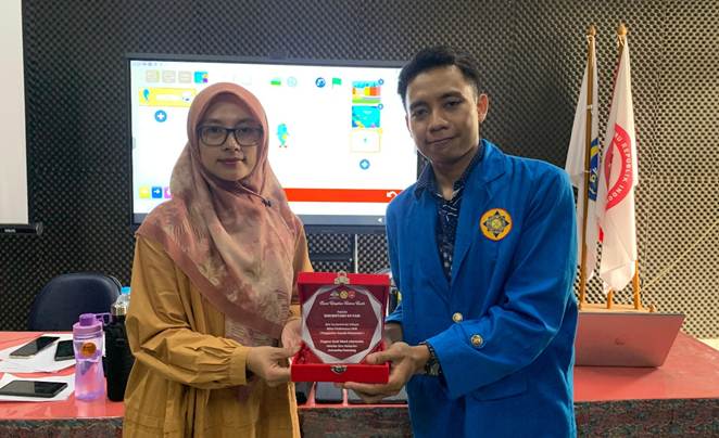Gambar 3. Ketua Tim PKM-PM menyerahkan plakat kepada Kepala SDN 04 Bintaro Pagi sebagai simbol kerja sama dan pelaksanaan program pengabdian kepada masyarakat.