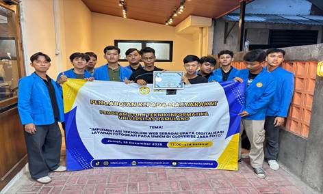 Tangerang — Cloverise merupakan salah satu UMKM di bidang jasa fotografi yang terus menunjukkan komitmen dalam meningkatkan kualitas layanan melalui pemanfaatan teknologi digital. Berdasarkan hasil wawancara dan observasi kegiatan pengabdian kepada masyarakat yang dilakukan oleh mahasiswa Program Studi Teknik Informatika Universitas Pamulang, Cloverise Jasa Foto menjadi mitra dalam program implementasi teknologi web sebagai upaya digitalisasi layanan fotografi.